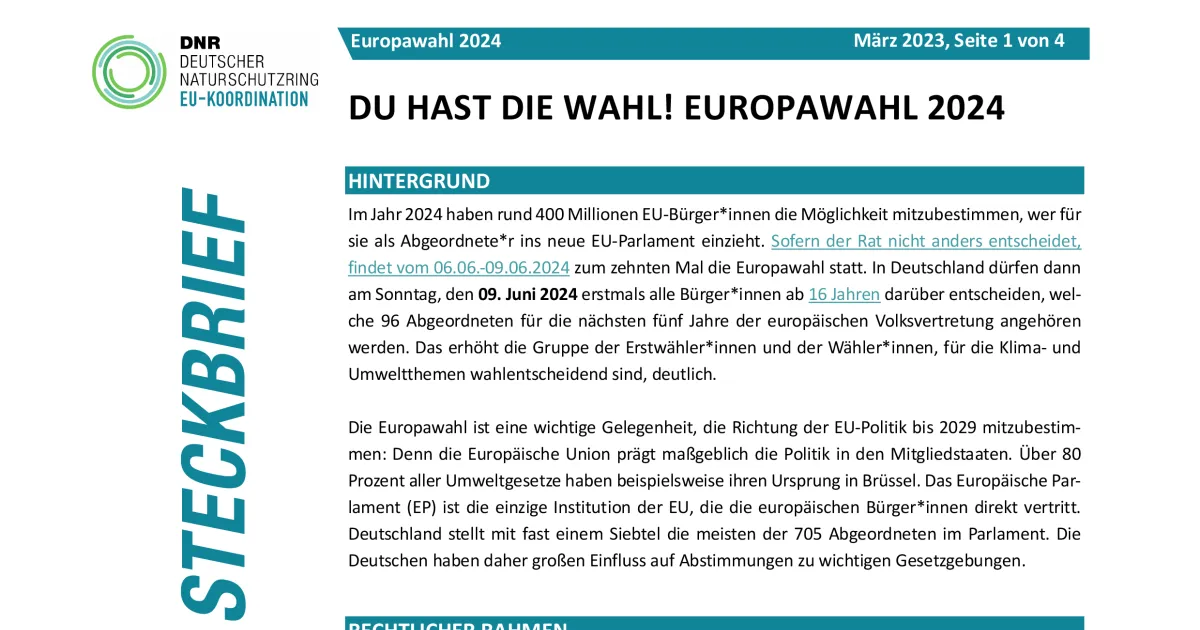 Die EU-Koordination des Deutschen Naturschutzrings hat in ihrem vierseitigen Steckbrief den rechtlichen Rahmen die Wahlen, den Stand der Debatte über Sperrklauseln und prozentuale Parteihürden, Fraktionen im EU-Parlament, erste Wahlprognosen und die weiteren Schritte nach den Wahlen zusammengefasst. Denn dann bestimmen die frisch gebackenen MdEPs - die Mitglieder des Europäischen Parlaments - auch über die Zusammensetzung der nächsten EU-Kommission mit. [jg]