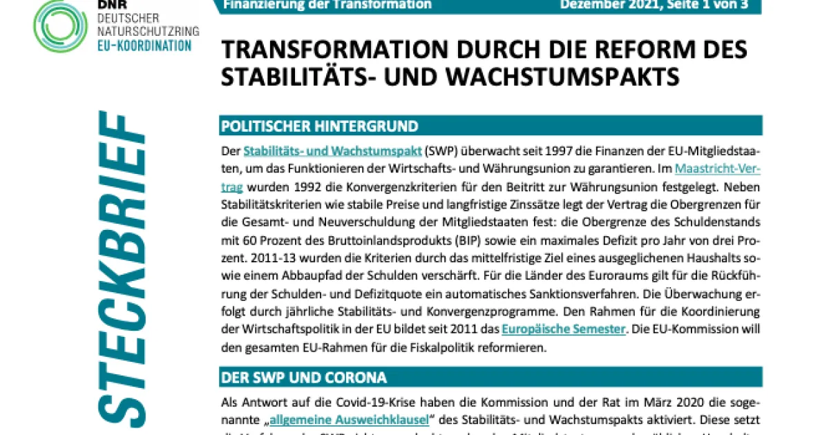 Ein neuer Steckbrief der EU- Koordination informiert über die Reformbestrebungen des Stabilitäts- und Wachstumspakts (SWP). Umweltverbände fordern eine Abkehr von der Schuldenbremse.